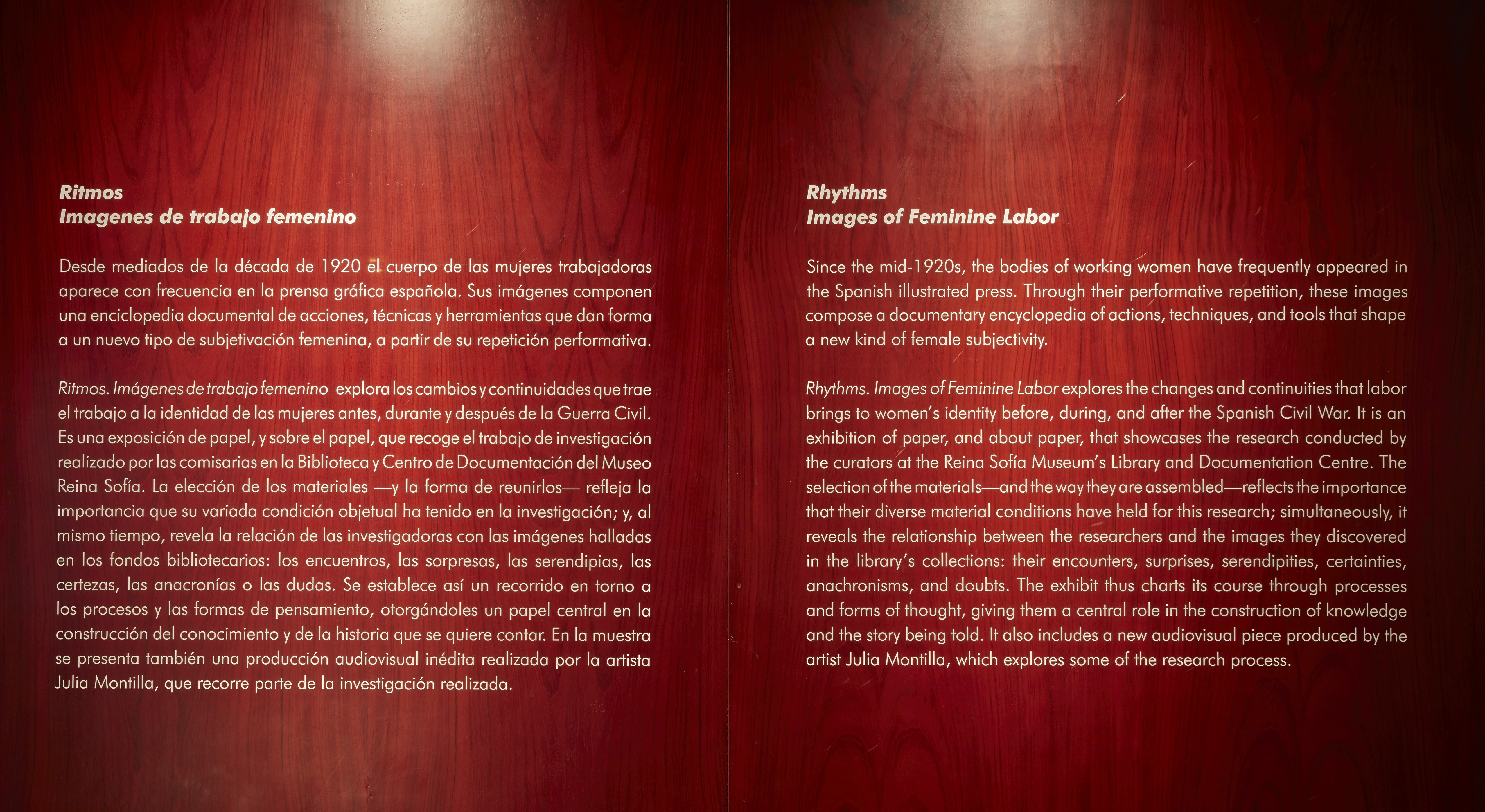 Ritmos. Imágenes de trabajo femenino explora los cambios y continuidades que trae el trabajo a la identidad de las mujeres antes, durante y después de la Guerra Civil. Es una exposición de papel, y sobre el papel, que recoge el trabajo de investigación realizado por las comisarias en la Biblioteca y Centro de Documentación del Museo Reina Sofía.
